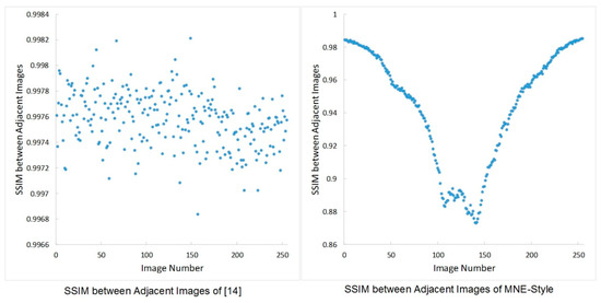 The comparison of SSIM of the adjacent composite images between our MNE-Style network and the network in Li et al. [16] is shown in Figure 12. There are differences among the images generated by our network, the SSIM of the adjacent images is approximately gaussian distributed. The textures generated with different standard texture images by our network are shown in Figure 13. MNE-Style not only stably maintains the texture characteristics of color, shape, and structure, but also generates rich texture images.