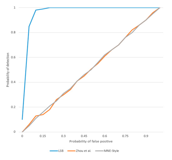 The mapping between the secret information and the coverless steganography codewords is generated by the MNE-Style in this study. The secret information hiding is transformed into the search for the diversity textures that meet the same condition. No modification of the secret-embedded image is performed in the process of the secret information transmission. The receiver operating characteristic (ROC) curve is used to test the resistance of different methods to steganalysis algorithms. We apply typical steganalysis algorithms which are improved by the standard Pairs method [30] to detect LSB replacement, Zhou et al. [10] and MNE-Style. In the experiment, we used 10% LSB steganography, and the step size of MNE-Style is 256. As shown in Figure 14, MNE-Style and Zhou et al.’s method [10] resist the detection from statistics-based steganalysis algorithms.