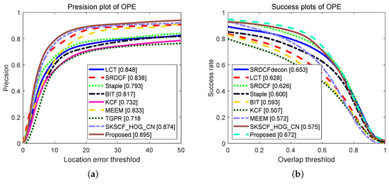 The precision and area under the curve for various trackers on OTB test suits. (a) OTB2013; (b) OTB2015; (c) OTB50.