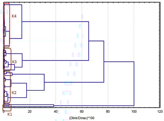 Hierarchical cluster analysis (joining tree mode) is an unsupervised pattern recognition method whose aim is to construct patterns of similarity either between objects of interest described by various features (variables) or between the different features related to the objects. The major steps in performing hierarchical clustering from the data are: Data standardization (by z-transform) in order to eliminate differences in the variable dimensions; determination of a similarity measure between the objects of interest (normally squared Euclidean distances); linkage between the objects (among many options Ward’s method is often preferred) and, finally, assessment of the clusters significance (e.g., by Sneath’s criterion) []. The graphical output of the analysis is a tree-like plot called dendrogram. Very often it is said that the unsupervised pattern recognition is a spontaneous classification method without any preliminary training of the data set to follow a specific requirement to classify the data into a preliminary chosen number of similarity groups.