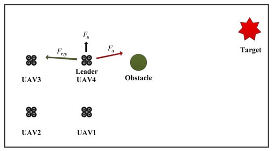 where and are constants, is the distance between the UAV and the obstacle. is the maximum working distance between the UAV and the obstacle. When the relative distance is greater than the maximum working distance, the obstacle has no force on the UAV.