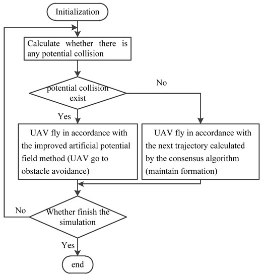 In this paper, two aspects are considered for the collision avoidance of the UAV cluster. One is that the UAV keeps the formation through the static obstacles, and the other is the collision avoidance between the two UAV groups that maintain the formation. The UAV formation flying collision avoidance method based on consensus algorithm are shown in Figure 4.