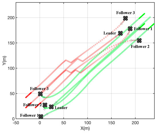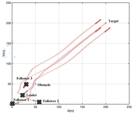 Figure 5 records the actual motion trajectories of the four UAVs, each of which took maneuvering measures to avoid collisions when encountering obstacles. In the initial formation of the formation, the UAV group formed a formation according to the consensus algorithm. When the obstacles were encountered, the UAVs in the UAV group performed the movement operation according to the improved artificial potential field method, then re-formed the formation. After the leader UAV reached the target position, the remaining follower UAVs slowed down and hovered in formation.