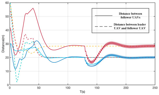Figure 6. shows the relative distance between each pair of UAVs in the UAV group over time. From the curve in the figure, it can be seen that there is no collision between the UAVs, and the distance between the UAVs gradually stabilizes with the passage of time after passing through the obstacles, indicating that the UAV has formed a stable formation without the leader. After the UAV reached the target point, the follower UAVs shook back and forth nearby and slowly stabilized into a formation. When the leader UAV arrived at the target position, the follower UAVs continued to fly forward due to inertia, while the leader UAV slowed down, so the relative position between the leader UAV and follower UAVs suddenly became smaller, as shown in Figure 6.