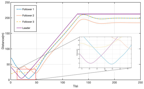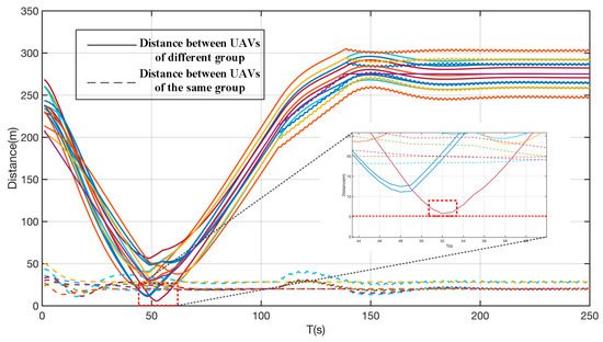 Figure 10 shows the position of the UAV relative to the other UAV group over time. As can be seen from the enlarged partial view, the closest distance between the two UAVs is 5 m. The successful collision avoidance of the UAV group was realized during the flight. In the figure, the solid line indicates the relative distance between different groups of UAVs, and the dashed line indicates the relative distance between the UAVs in the same group. The initial relative distance was less than 50 m, which was the relative distance between the unmanned aerial vehicles in the same group, and the relative distance between the unmanned aerial vehicles in different groups was greater than 50 m. It can be seen from the dotted line that the closest relative distance between the UAVs in the same group was also greater than 5 m.