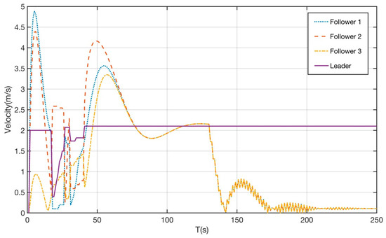 Figure 8 records the velocity versus time curve of each UAV during flight. It can also be seen from the velocity curve that the UAV group is divided into three phases during the flight. The first phase is gradually changed from the irregular initial state. Forming a formation, so in the early follower UAVs, they first accelerated and then decelerated to achieve formation. When the obstacles were encountered, each UAV moved according to the trajectory generated by the artificial potential field. After the successful collision avoidance, the UAV group decelerated to a stable velocity to form a formation. Finally the UAV group reached the target point and then gradually slowed to a velocity close to 0, indicating that the UAV was in a hovering state. The three curves gradually return to zero, and one maintained the original velocity. Therefore, this means that the velocity of the three UAVs gradually decreased to near zero, and only one UAV maintained the original velocity. This is because the UAV cluster flight is based on the leader–follower model, and the leader UAV’s target velocity was set, so the performance in the simulation was that the leader UAV will shake at the original velocity when arrived at the target position, while the other followers UAV gradually reduced the velocity and formed a formation. In summary, three UAV gradually stopped, and the leader UAV swayed at the original velocity.