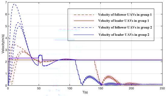 In this experiment, there were two groups of UAVs. Each group of UAV consists of four UAVs. One of the UAVs is the lead UAV. The target position, initial position and initial velocity were set in advance. The initial position and initial velocity of the follower UAVs were also set in advance. The initial positions of the eight UAVs of the two groups of UAVs are shown in Table 2.