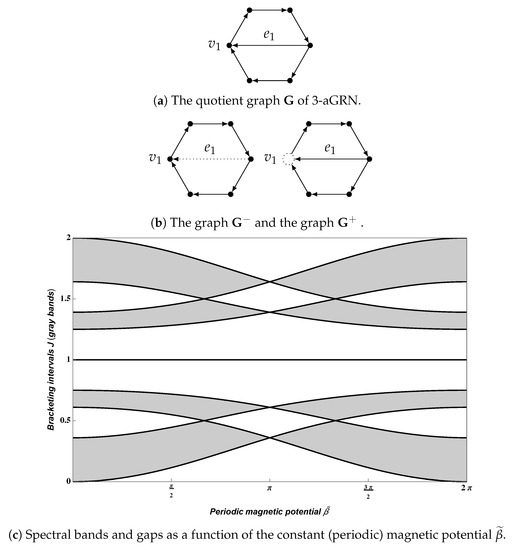 -covering graph and a periodic magnetic potential. Consider a fundamental domain and with magnetic potential β, where . The functions m and β are induced by and respectively. Letbe the image of the connectivity arcs on the quotient and in the neighborhood of . Define bythe corresponding arc and vertex virtualized graphs, respectively. Thenwhere the eigenvalues of and are written in ascending order and repeated according to their multiplicities. Proof. Now, by the bracketing technique of Theorem 1, we have for any potential with the lifting property