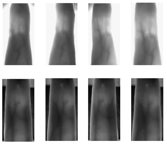 The performance and quality of the results in the recognition of finger vein patterns have been improved by several approaches in recent years [17,27,28]. During the image acquisition process, the captured images present deformation effects due to the contactless capturing procedure, as is shown in Figure 1. Commonly, most of the methods try to prevent the influence of these deformations in recognition performance. On the contrary, the approach proposed by Meng et al. [27] is highlighted because it proves that the displacement information between finger vein images can be used as discriminatory information, achieving a high recognition performance. The principles introduced in the work by the authors of [27] prove that the geometric structure of finger vein images remains invariant, despite the affine transformations produced during the acquisition process. These considerations are closely related to the most modern interpretation of symmetry phenomena introduced by Darvas [29]. Thus, the proposed approach applies the generalized symmetry concept [29] in order to establish the correspondences between genuine and imposter samples. However, the main disadvantage of their methodology is related to the high computation time of the matching process due to the dense correspondence between images.