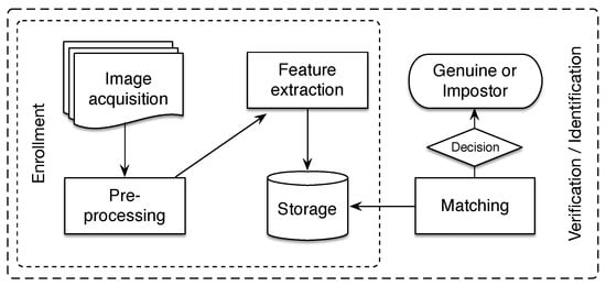 Unar et al. [4] extensively review the biometric technology along their potentialities, market value, trends, and prospects. A biometric system aims to recognize the identity of a person based on its physiological characteristics or other behavioral traits [5,6]. Jain et al. [5] established the criteria that should be satisfied by any biometric trait, essentially: universality, distinctiveness, collectability, performance, acceptability, and circumvention. Thus, several types of biometric traits have been proposed, such as fingerprint [7,8], face [9,10], iris [11,12], palmprint [13,14], voice [15,16], finger and palm vein [17,18], gait [19,20], signature [21,22], DNA [23,24], among others.