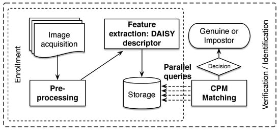 In this section, we present the different processes of the proposed finger vein recognition method, which is depicted in Figure 4. In the following, we pay special attention to our main contributions highlighted in bold text in the above figure. As a typical finger vein system, the presented methodology is composed of four processes for enrollment and verification/identification stages. The flowchart starts by capturing finger vein image samples. For this purpose, a scanner device with NIR illumination (700–1000 nm) is often used. Later, a preprocessing step is required for segmentation of the ROI and to improve the quality of the image. From the final enhanced image, we compute the DAISY descriptor [71] for every pixel on all hierarchical levels, which represents stored finger vein samples in the database. During the verification/identification stage, the matching process is performed by CPM algorithm [38], resulting in the displacement matrices. Finally, the similarity score between finger vein samples is calculated on the basis of the uniformity degree of the displacements matrices, which is represented by the feature of the uniformity texture [66].