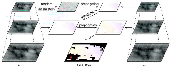 The matching process of the proposed methodology is based on a sparse technique to obtain the displacement matrices between finger vein samples. We use the CPM algorithm [38] to compute sparse correspondences between patches of finger vein images to be compared. Contrary to the baseline method [27], which finds dense correspondences for each pixel of the image, the CPM algorithm [38] combines a random search strategy with a coarse-to-fine scheme for matching correspondences with larger patch size. Thus, the matching process implements a fast approximate structure in order to avoid finding correspondences of every pixel, which reaches a significant reduction of the computation time. An overview of the CPM matching is given in Figure 6.