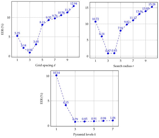 In the works by the authors of [36,38], the authors of CPM analyzed the parameter sensitivity of the algorithm. They found the parameter settings achieved the best accuracy results while also reducing computation complexity. However, to get better performance and to decrease the execution time of CPM for finger vein recognition, we optimize the parameter set for this task. For this purpose, we empirically vary the parameter setting each by one and maintaining the rest as proposed by the authors of [36,38]. Figure 9 summarizes the results for each parameter, we report the EER on a training set of finger vein images from both databases. The training set was randomly selected using 20% of each database. We did not use each dataset separately because both do not have a large number of subjects. Thus, the obtained parameter settings have been optimized for finger vein recognition tasks in general. Different from the rest of the experiments, EER (equal error rate) values are reported in percent (%), in order to obtain a clear representation of the charts.