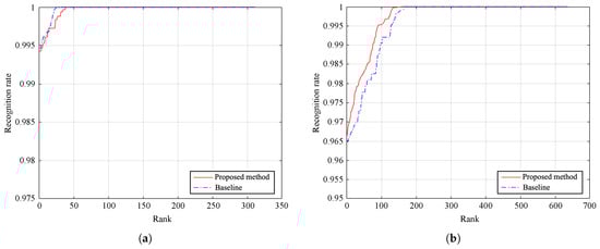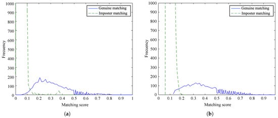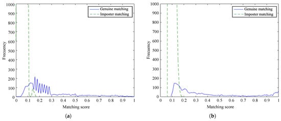 Distribution of matching scores on the SDU-MLA dataset: (a) proposed method and (b) baseline method.