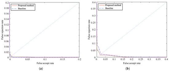 The accuracy results of our method are contrasted with the baseline algorithm [27]. Figure 12 depicts ROC curves obtained for FAR (false acceptance rate) and FRR (false rejection rate) results on both databases. Besides, Table 3 compares the results of EER (equal error rate), FRR at-zero-FAR, and FAR at-zero-FRR.