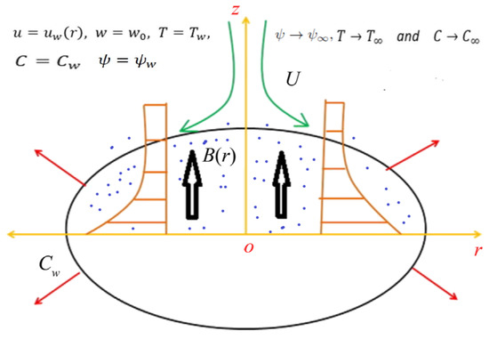 We consider the steady axisymmetric MHD flow of an electrically conducting incompressible viscous flow immersed in nano-fluid over a stretching sheet. The geometry of the problem is illustrated in Figure 1. The flow of conductive fluids is caused by the sheet stretching in the direction, where is a dimensional constant. It is considered that there is no nanoparticle flux across the wall and the surface is stretching along z-direction. Furthermore, it is assumed that , and denotes the stretching sheet temperature, solute concentration and the nano-particle fraction at the sheet respectively. At the infinity the , and are the ambient temperature, ambient solute concentration and ambient nano-particle volume fraction, respectively. In the current study, summarizes the strength of magnetic field, where is a uniform magnetic field strength. The magnetic field acts along normal to the sheet in the positive z-direction. When the magnetic field is varying in the radial direction, it also vary in the vertical direction, since the divergence of B should be zero, that is, . Under the boundary layer approximation, the equations of mass conservation, linear momentum conservation, energy conservation and nano-particle volume fraction (see References [30,34,35,36]) can be obtained as: