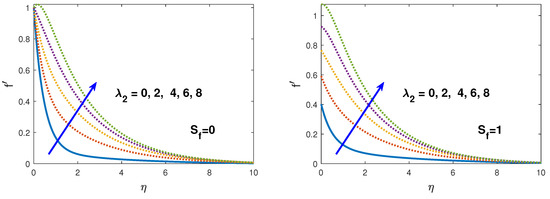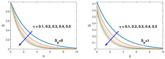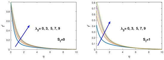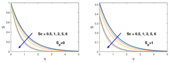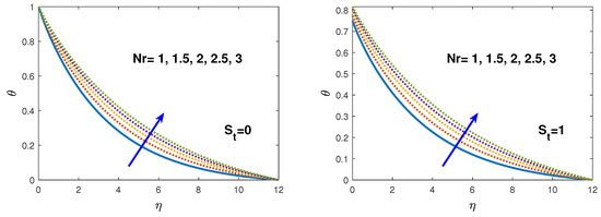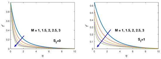 The calculations were carried out for fixed values of the parameters , , , , , , , , , . Convergence of the finite element method is reflected in Table 1, which explicates no significant variation in the values of f, h, , S and when the number of elements passes through 320. In order to prove the validity of the numerical results in Table 2, Table 3 and Table 4, current study archived an excellent correlation and exact solution as in the studies of Crane [31] data, Gireesha et al. [32], Mudassar et al. [33], Mabood and Das [43], Fazle Mabood et al. [29] and Ali [44]. An excellent correlation has been obtained and a grid invariance test has been conducted to maintain 4 decimal point accuracy. Table 5 displays the computed skin friction, heat and mass transfer coefficients which are expressed as , and , respectively for different values of M, , , , , and . It was noted that the skin friction increases while heat and mass transfer coefficient decreases as M increases. Also mass transfer coefficient increases as increases, heat transfer coefficient increases with increase in while the heat transfer coefficient decreases as accelerates. The Skin friction coefficient retarded whereas, heat and mass transfer coefficients amplified with the enhancement in the buoyancy parameters (). The velocity profile decreases in both cases of hydrodynamic slip () and no hydrodynamic slip () with the increase in magnetic parameter, the results are depicted in Figure 2. These results are in accordance with the previous contributions [29]. This shows that the Lorentz force slows down the speed of the fluid in a radial direction. However, with existence of the hydrodynamic slip as can be clearly seen in Figure 2 that velocity boundary layer increased. Figure 3 shows that the temperature increases with the increase in the value of the magnetic parameter in the presence and absence of thermal slip conditions. Figure 4 demonstrates that the effect of solutal slip for concentration increased in the boundary layer while increasing in the magnetic parameter M. The velocity distribution increases as the value of buoyancy parameters (, , ) accelerated in the presence and absence of multiple slip conditions (hydrodynamic slip and no hydrodynamic slip, thermal slip and no thermal slip, solute slip and no solute slip) the results maybe seen in Figure 5, Figure 6 and Figure 7. The variation of temperature profile with the increase in thermal radiation parameter thermal slip and no thermal slip conditions are described in Figure 8. The temperature distribution increases with the increase of thermal radiation, which leads to the enormous heat transfer rate through the nano-fluid and the surface. Effect of on concentration profile in nano-fluid slip condition is reflected in Figure 9, the concentration profiles elucidate an opposite behavior for growing values of that the thickness of nanoparticle concentration boundary layer reduces with the increasing values for . It is observed that the increase in the number of Schmidt slows down the concentration distribution of nano-particles, which led to delays in concentration and heat transfer rates. The effects of solutal slip was examined to reduce concentration on the boundary layer with the increase in the stretching parameter n, Schmidt number and chemical reaction parameter, results are graphically depicted in Figure 10, Figure 11 and Figure 12.