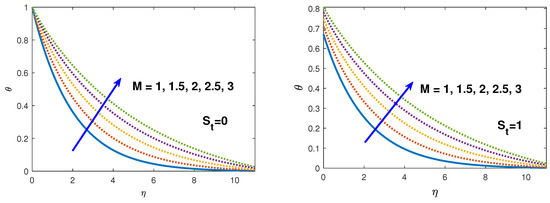 Effect of M on temperature distribution in the presence and absence of thermal slip condition .