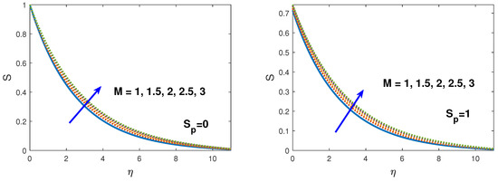Effect of M on solute concentration in the presence and absence of solute slip condition .