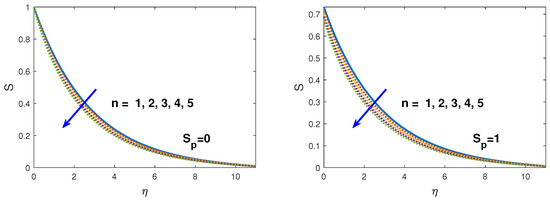 Effect of n on solute concentration in the presence and absence of solutal slip condition .