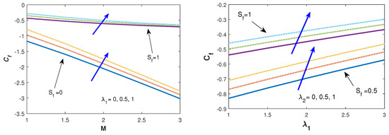 Effect of M, and in hydrodynamic slip condition on Skin friction coefficient.
