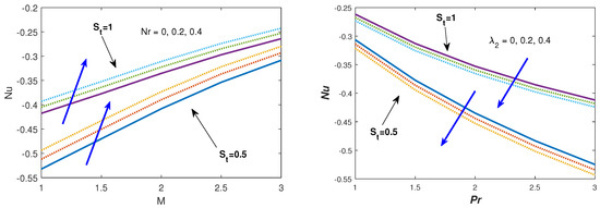 Effect of M, , and in thermal slip condition on Nusselt number.