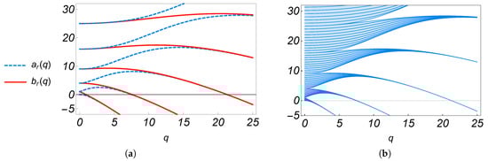 (a) The characteristic values (blue-dashed curves) for , and (red curves) for , as functions of q, for several values of . Note that . (b) The shaded region is produced by all the characteristic curves with non-integer characteristic values r, case in which .