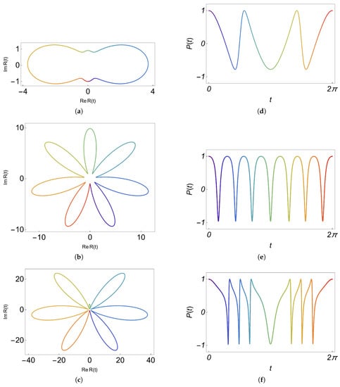 The driving field (23) in the complex plane for , , (a) , , , , (b) , , , , (c) , , , . In (d–f), the corresponding population inversion is shown. All of the previous values of correspond to characteristic values of the Mathieu functions (16) with rational values of r, that is, . Time flows from blue to red matching the scale between the types of plots.