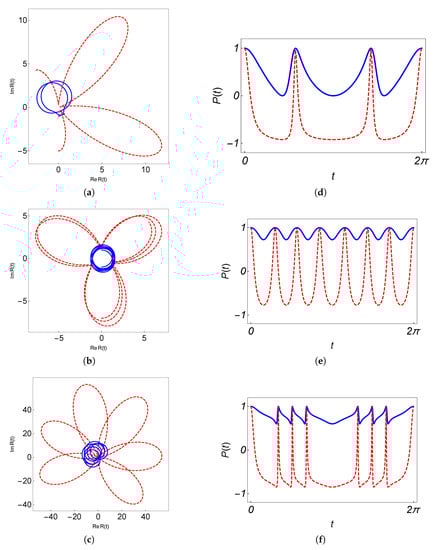 Figure 3 shows three examples of periodic driving fields and their associated population inversion. In these cases, the characteristic exponent r is a rational number, so the associated is periodic and the parameters g and are such that is a periodic function of time. Furthermore, in order to show the time flow correspondence between the left plots with the right ones, a color scale from blue to red has been used. As can be observed from Figure 3b,e, each minimum of the population inversion barely corresponds to a local maximum of the transverse driving field amplitude . Furthermore, the non-negative parameter p is related to the number of “petals” in each flower-like structure of the driving field. In [12], it is shown that our model can describe a two-level system interacting with a magnetic transverse field . It is easy to show that real and imaginary parts of are nothing other than the field components performing a certain rotation. This fact is due to the transverse field causing the state to instantaneously precess around the direction of the entire field, the direction of such precession becomes more horizontal while . Thus, when the relative orientation between the field direction and the state direction on the Bloch sphere becomes more perpendicular, the states rotates more extremely on the sphere, being able to reach a more extreme position there, just as it happens in the case of a circularly polarized field [31]. These rotations becomes more effective the bigger the field is because the instantaneous angular frequency depends on it. When the value of the parameter is changed, with the others held constant, an oscillatory non-periodic driving field is obtained (see the continuous blue curves in Figure 4). In this case, the changes in the amplitude of the driving field are not fast enough for the population inversion to reach its minimum value −1. Now, by only increasing the parameter g and holding the others fixed (the magnitude of is proportional to ), we observe in Figure 4 (red dashed curves) that the changes in the amplitude of the driving field are increased with respect to the previous case, pushing the increment of the range of the peaks of the population inversion towards . The positions of the maxima of the population inversion remain unchanged. We can conclude, in this case, that as the parameter g increases, the peaks of the population inversion are sharpened, presenting a resonant-like behavior. Furthermore, in any of the previous cases, as shown at the end of Section 3.1, the population inversion is periodic.