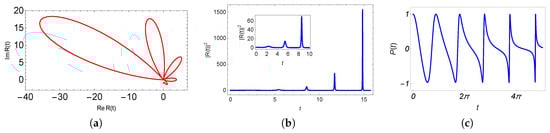 As mentioned above, at least one of the Mathieu functions, which conform the solution to the Ermakov equation, is an unbounded function diverging as . In this case, we have observed that the zeros of the Mathieu functions and tend to approach each other more and more as t increases, a phenomenon known as condensation of zeros [19]. This gives rise to pulsed-like peaks in the corresponding driving field (), as can be observed in Figure 5a. Therefore, as time passes, the pulses increase their size and become narrower causing a pulsed-like behavior of the population inversion, as can be observed in Figure 5b,c.
