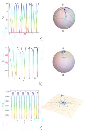 Figure 6 shows three examples of such an effect from a large variation in the initial state until a smaller one in terms of parameters , and . Those parameters work in a combined way to give dynamical effects, thus, they are not related with the periodicity of , of in an exclusive way. In this sense, examples being considered are only illustrative among a wide variety of possibilities (obtained numerically upon the conditions ), but exhibiting different ranges of variation for . In any case, note that g and play an important role in such variation, as is expected. Plots on the left exhibit the value of while plots on the right show the dynamics represented on the Bloch sphere. Nevertheless, evolution loops are independent from the initial states, examples consider the initial state as the ground state, . The color changes from blue to red in agreement with the value. Note that the intermediate reaching of unitary multiples of with non-zero phases until the zero phase is reached in . The last example in Figure 6c meets the evolution loop under periodic driving field, generating a more regular dynamics around .