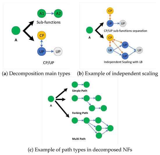 (a) Decomposition main types: decomposition into sub-functions or control/user planes. (b) Example of independent scaling of one sub-function in the decomposed user plane. (c) Example of path types, which might be generated after decomposing a single NF.