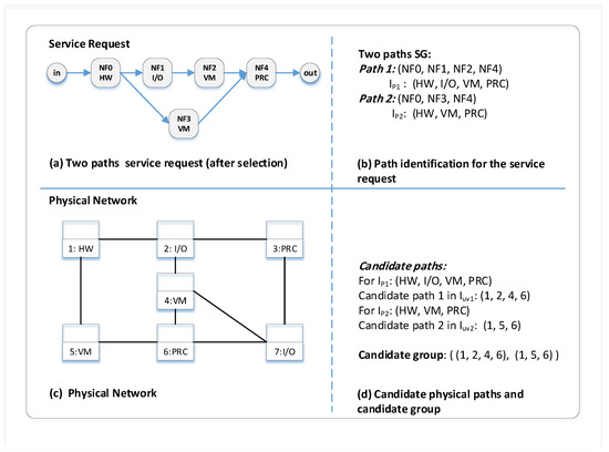 To realize the proposed path mapping approach on NFV, we suggest to implement as a catalogue in the NFVI repository under the name of “catalogue of physical paths.” Figure 2 shows an example of implementing and , which are used to get the path list by calling Equation (4). Then, a candidate group is built by selecting one path from each list we retrieved from Equation (4).