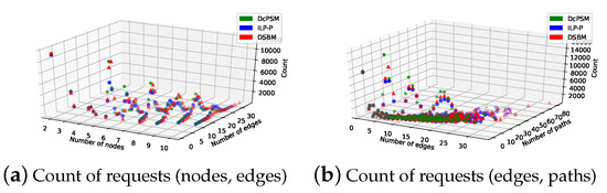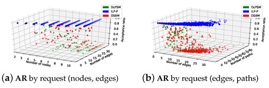 As expected, the increase of virtual links and paths has a high impact on the acceptance ratio compared to the increase of nodes. Figure 8 shows that the low acceptance ratios are distributed over the nodes axis and over edges axis for both DSBM and DcPSM. However, the low acceptance ratios are concentrating on the service requests with a high number of edges and paths as shown in Figure 8.