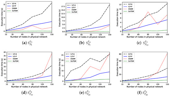 From Figure 5, it is clear that the proposed ILP-P and DcPSM show moderate increase of execution time when the physical nodes number increases, which tells that using the proposed path mapping approach can be more suitable for mapping mobile core network functions. In this experiment, the generated nodes for , , and has been uniformly distributed between 5 and 10, while the other version of service requests for , , and has been generated based on a fixed number of nodes equals to 10 virtual nodes. The results of all 6 scenarios show that the proposed ILP-P and DcPSM reduce the execution time to 39.58% and 6.42% of the execution times of the existing ILP-A and DSBM, respectively.