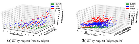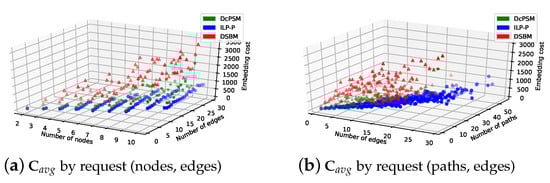 Figure 9 and Figure 10 show that the proposed ILP-P and DcPSM can perform the embedding process with lower cost compared to DSBM. More specifically, ILP-P reduces the embedding cost by 4% compared to ILP-A in the small-scale networks for all request types, while in the long simulation runs, the average embedding cost of DSBM is 297% and 295% higher than the proposed ILP-P and DcPSM, respectively.