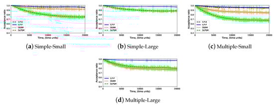 Average acceptance ratio for: (a) Simple-Small, (b) Simple-Large, (c) Multiple-Small, and (d) Multiple-Large scenarios. The shaded background behind each curve represents the 95% confidence interval on the reported average values.