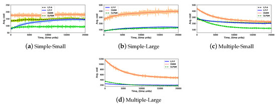 Average embedding cost for: (a) Simple-Small, (b) Simple-Large, (c) Multiple-Small, and (d) Multiple-Large scenarios. The shaded background behind each curve represents the 95% confidence interval on the reported average values.