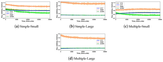 Average cost to average revenue for: (a) Simple-Small, (b) Simple-Large, (c) Multiple-Small, and (d) Multiple-Large scenarios. The shaded background behind each curve represents the 95% confidence interval on the reported average values.