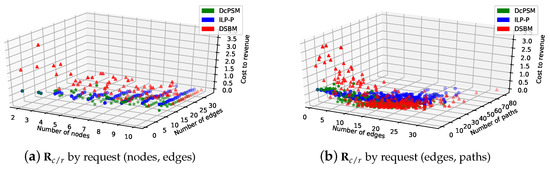 The ratio of average embedding cost to average revenue must be less than 1 in order for the NFVI provider to get the financial benefit. As we can see in Figure 11, the proposed ILP-P and DcPSM show the best ratios of embedding cost to revenue in all scenarios while the DSBM shows the worst ratios. Due to the proposed path mapping approach, ILP-P and DcPSM overcomes all compared schemes in terms of the ratio of average cost to revenue, as shown in Figure 12. As for the DSBM, it shows the worst ratio of average cost to revenue due to the high possibility of clustering virtual nodes. The clustering of nodes might reduce the embedding cost but it might also lead to request rejection since it may select a service decomposition with high number of edges and paths, as in Figure 8.