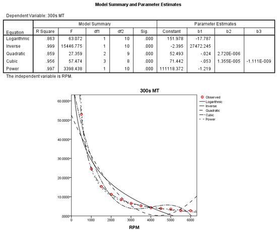 From Section 2.1, Section 2.2 and Section 2.3, we derived a curve-estimated function for each case. Figure 7 shows that all functions provided an estimate that was statistically equivalent to the MT values. These results suggest that the estimated function can be induced for other RPMs and times.