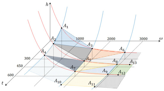 Let be the intersection of the function values of for functions obtained in Section 2. We then split the graph of the two-parameter function into a plane passing through three points as shown below (Figure 9).