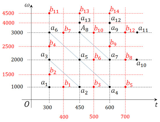 We took points from to in the domain of using the six curves described in Section 2 to find the approximate function for the binary function . The domain was then divided into sub-areas , passing through three points, , and . We obtained equations of planes passing through , and , corresponding to the MT values of , and at each vertex of , respectively. We then estimated the polyhedron approximation, , as shown in Equation (9). To assess the suitability of the polyhedron approximation , we set 14 points of in the domain D. The values listed in Table 12 were determined by substituting and . Then, a paired sample t-test was performed between and values, i.e., the curve approximation data from Section 2 and the data obtained by substituting the equation of polyhedron , respectively, to determine whether the mean was statistically identical within of the significance level. Our results revealed that the polyhedron approximation contained six of the curves from Section 2; thus, our function provides a good approximation of the binary function .