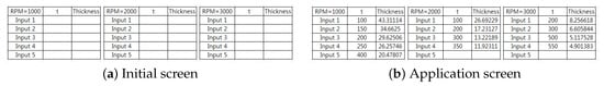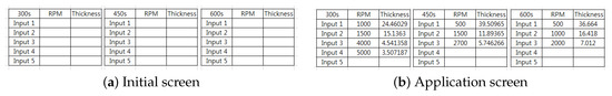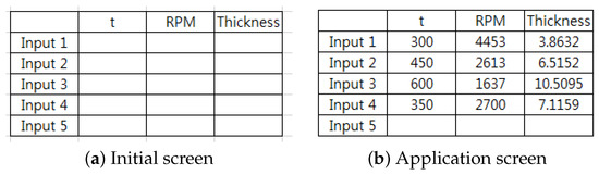 Based on the results of this study, we developed a thickness calculator using the Microsoft Office Excel program (Microsoft Corp., Redmond, WA, USA). Here, we show screen shots of the initial screen and application screen of the calculator. This calculator can predict the thickness without actual experimentation. As you can see in Figure 12, Figure 13 and Figure 14 below, they are shown for and . We will supply our calculator to companies free of charge, in order to help them achieve the desired coating thickness in spin coating processes.