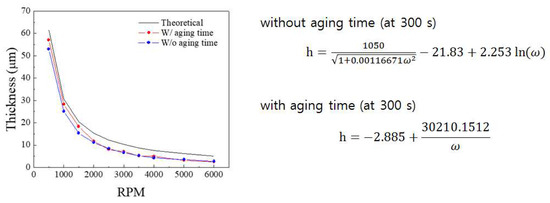 We are working on data at fixed conditions of 300 s, as well as different times or fixed RPM conditions, and we will do further research. As shown in Figure 15 below, the experiment was conducted under different conditions, and it was confirmed that the thickness was changed due to the parameters that were not considered in the existing equation. For example, when the aging time is given after spin coating for a fixed condition of 300 s, the thickness changes as shown in the attached figure and the equation, and the equation obtained through curve estimation also changes. In addition, it is expected that process conditions for the manufacture of the desired thickness can be derived simply. In addition, it will be possible to apply to other materials, and further experiments are planned.
