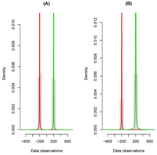 We assume that the data points , , are conditionally independent given the Cauchy mixture model with parameter vector . In the notation of Equation (3), the components are now Cauchy densities.