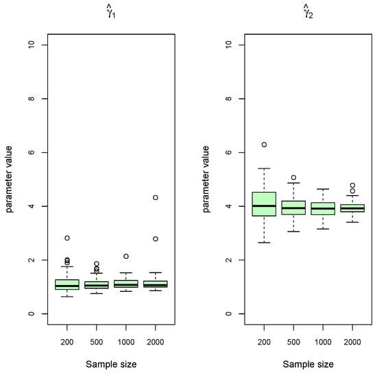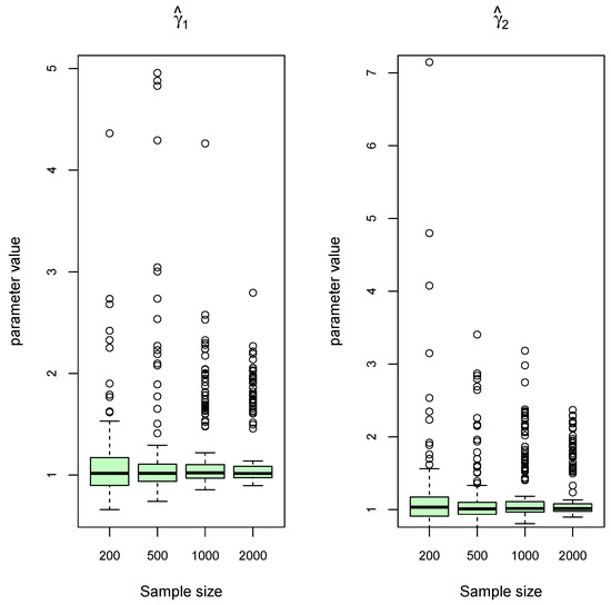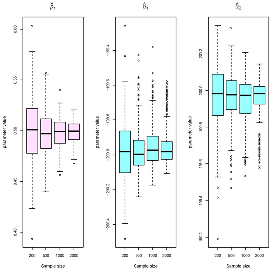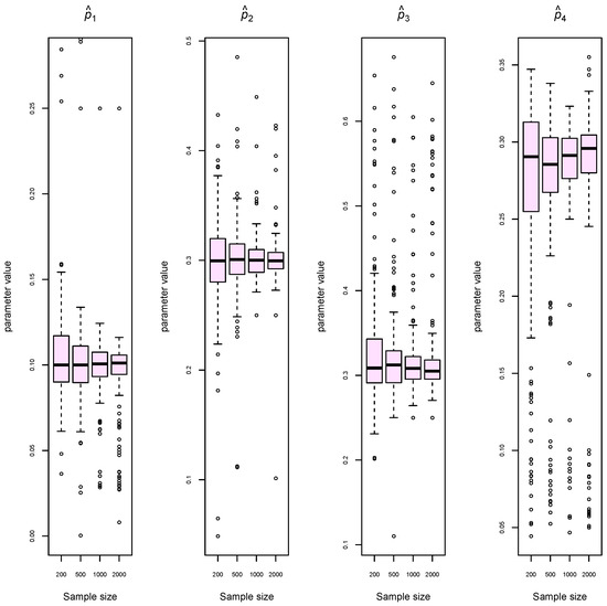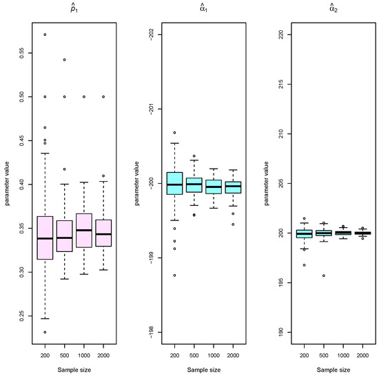 We next carroed out the actual simulation study in order to study the consistency properties of the proposed estimators. For each simulation scenario, we considered sample sizes of and 2000; moreover, we replicated the process 200 times for each simulated mixture model. For the initialization of location parameters as described in Section 3, we used Setting (iii) throughout.