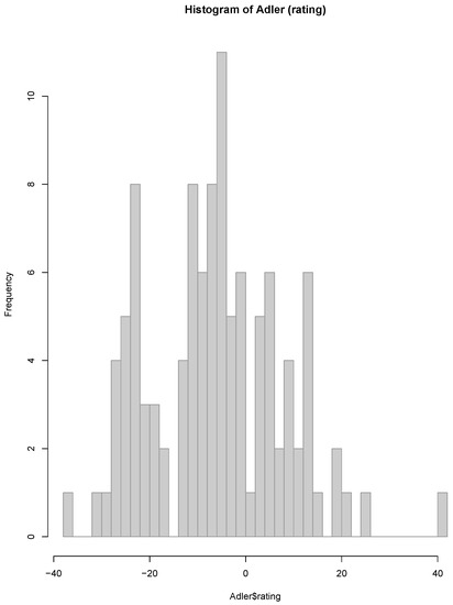 This dataset contains 108 observations on a numerical variable, rating, and two categorical variables, instruction and expectation. We are only interested in the rating variable, which are “average ratings of apparent success of people in pictures who were pre-selected for their average appearance of success” [25].
