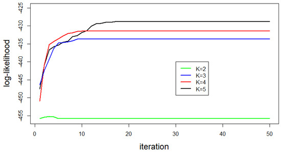 The current value of the log-likelihood, , can be recorded by plugging into Equation (3). The E-step and the M-step are iterated until some pre-specified criterion is met. We do not advise to base this criterion on the difference between values of two consecutive iterations. Firstly, this method has attracted some general criticism in the literature (being a measure of “lack of progress” rather than actual convergence [23]). Secondly, since our estimates in the M-step are only approximations of the MLEs, we lose the theoretical guarantee of monotonicity and convergence that EM theory would otherwise have provided. Indeed, we have observed in some examples (illustrated in Section 5) that, especially in the case but sometimes also for , the likelihood trajectories may be slightly decreasing for short sequences of iterations. Hence, for these reasons, the recommendation is to work with a fixed number, S, of iterations ( has been sufficient in all examples and simulations considered), and chose subsequently the best solution along this path (in terms of likelihood), rather than the final (“converged”) one.
