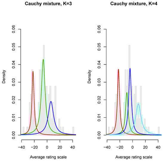 Fitted Cauchy mixtures for average ratings from Adler data: (Left) ; and (right) .